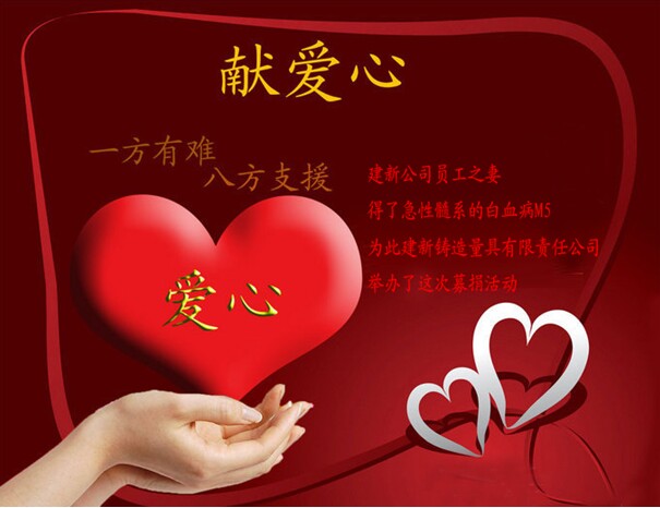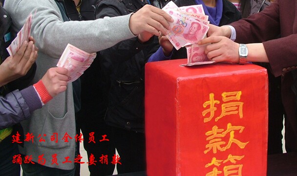 2014年7月1日下午,建新公司簡(jiǎn)單的舉行了“向員工明福濤之妻獻(xiàn)愛(ài)心”的募捐儀式,用一份份真摯的愛(ài)心筑起希望的長(zhǎng)城。當(dāng)建新公司代表把錢(qián)親手送到員工手里時(shí),他熱淚盈眶。用深深的一個(gè)鞠躬表達(dá)了對(duì)建新全體員工的感激之情。